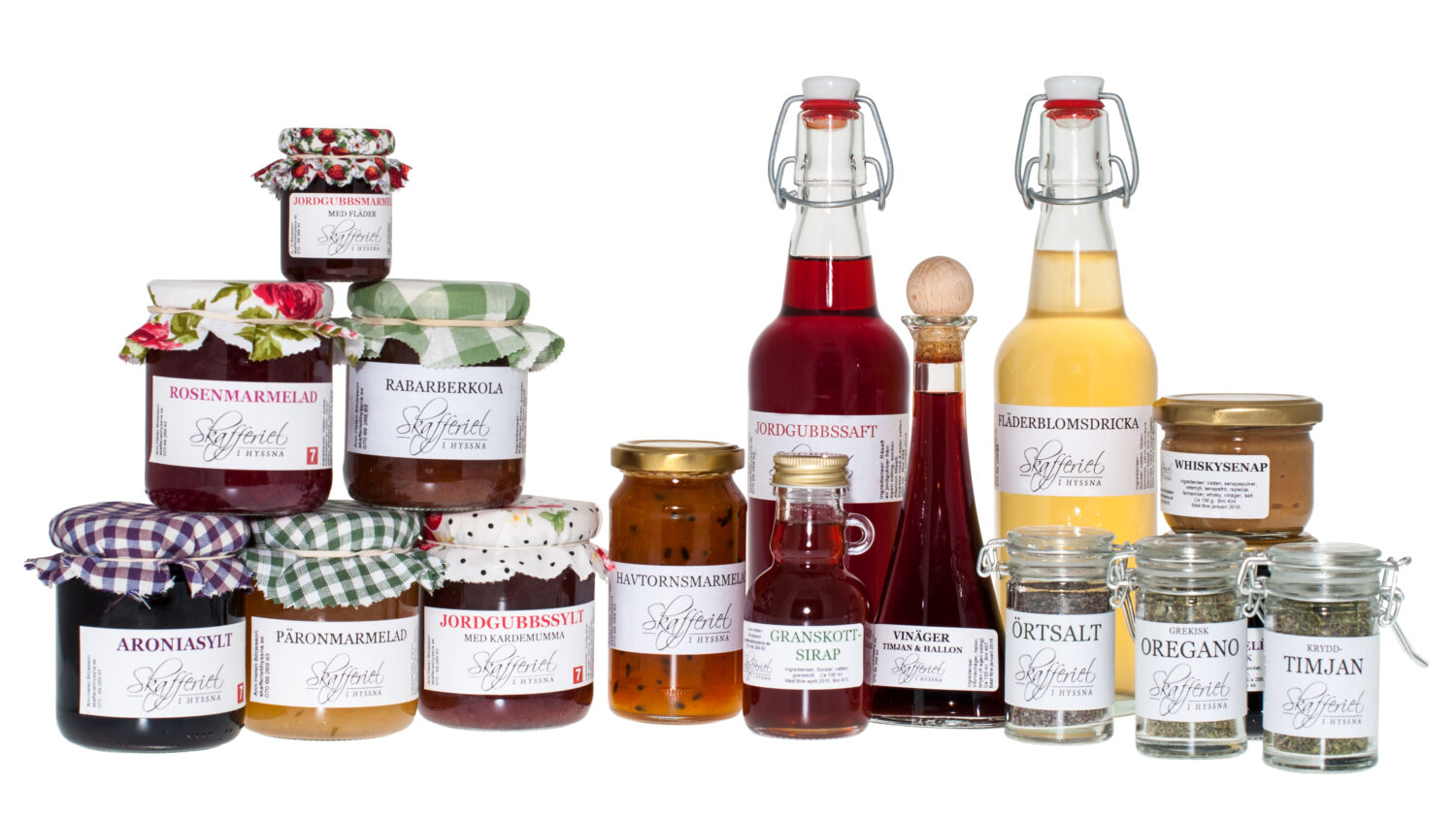 Hos oss hittar du ett varierat utbud av marmelad, sylt, gelé, saft, måltidsdrycker, sirap, vinäger, kryddor och mycket mer – allt tillverkat i vårt eget tillagningskök i Hyssna. Här finns både jordgubbssylt på farmors vis och andra läckra smakkombinationer – som limemarmelad med chili.